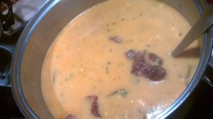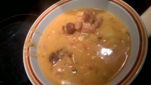 Annyi az eltérés, hogy először a vízbe a füstölt húst teszem fel főni (lehet csontos is), amikor már majdnem puha, akkor a felkarikázott burgonyát, hagymát, babérlevelet és ha szükséges sót.